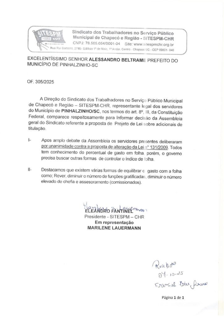 Ontem (07/10) a Presidenta do Sindicato em Pinhalzinho, Marilene Lauermann, protocolou ao Prefeito Alessandro Beltrame (PP) ofício informando a deliberação dos(as) servidores(as) presentes na Assembleia ocorrida em 02/10 com relação a proposta de alteração da Lei 131/2009. Por unanimidade, os(as) servidores(as) se posicionaram contrários ao Projeto de Lei de alteração na regulamentação e concessão dos Adicionais por Titulação.